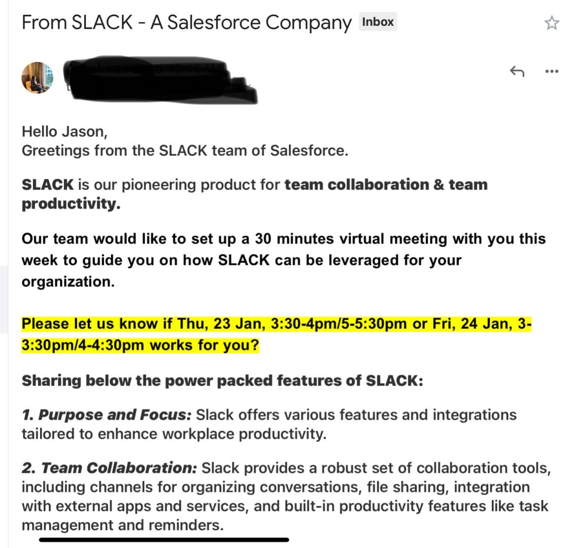 So below is an email I just received from the Slack team at Salesforce. It’s just … mid. It’s pretty bad. Even in 2025. Even with AI and Salesforce’s $300+ Billion market cap behind it: