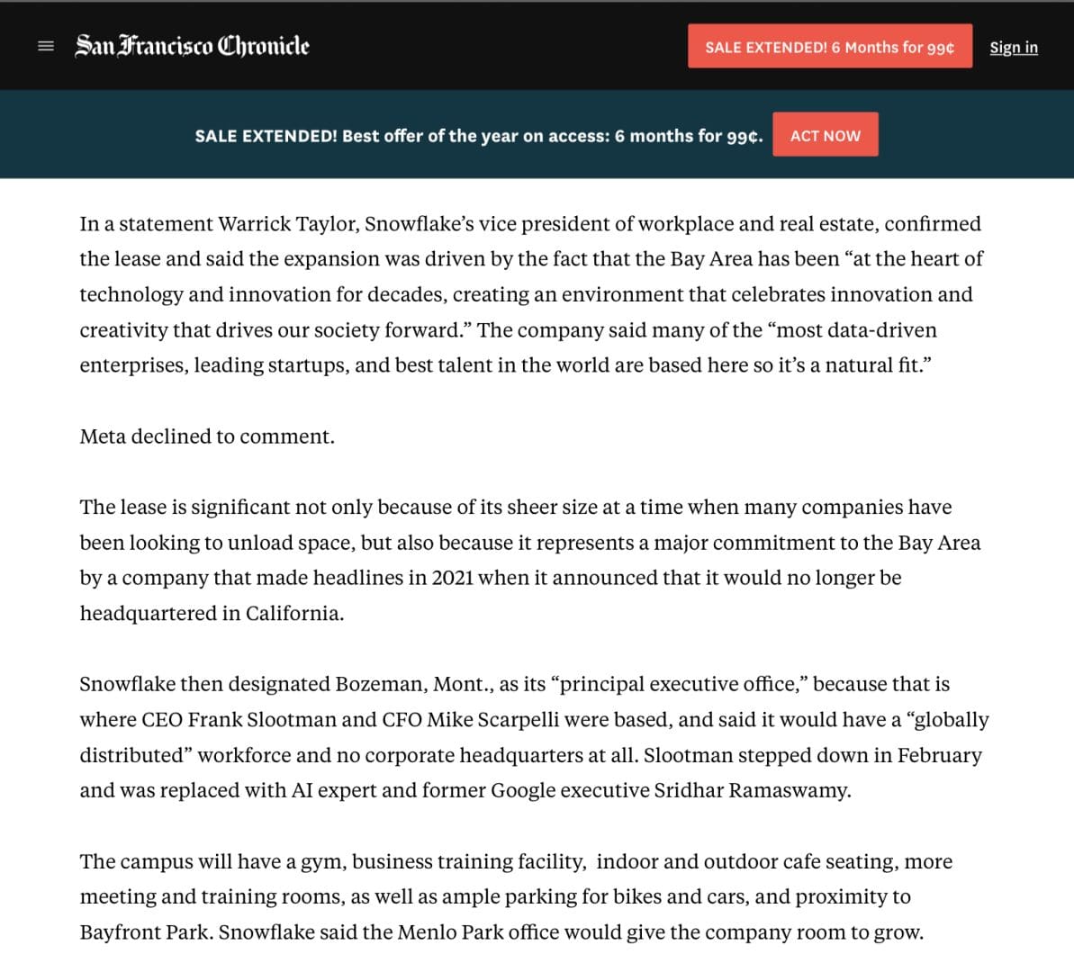 After going virtual and hybrid during the 2021 era, and moving its HQ to Bozeman Montana when ex-CEO Frank Slootman moved there… and officially leaving the SF Bay (albeit keeping its office in San Mateo) in 2021 … Snowflake is quadrupling down on the SF Bay Area in 2025.