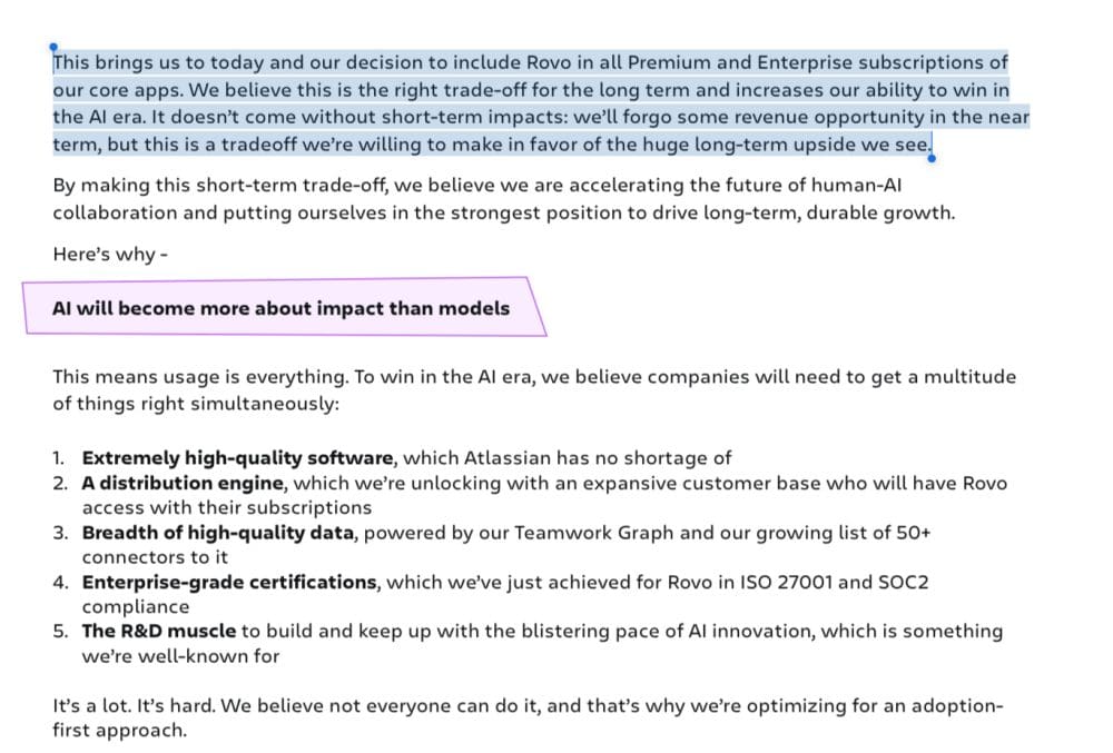 I personally didn’t think this would stick, and Atlassian is one of the first to say the same. It’s now including it’s AI platform Rovo at no additional cost for all but the biggest power users using the most AI: