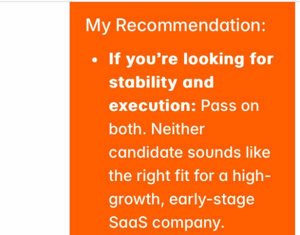 - Reviewed candidates and resumes — and told founders when to pass on problematic hires: