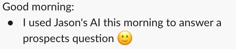 One is be our BDR for SaaStr sponsorships. Initially, it was OK and could answer support questions on its own. But then we uploaded the prospectus and trained it a bit, And wow.