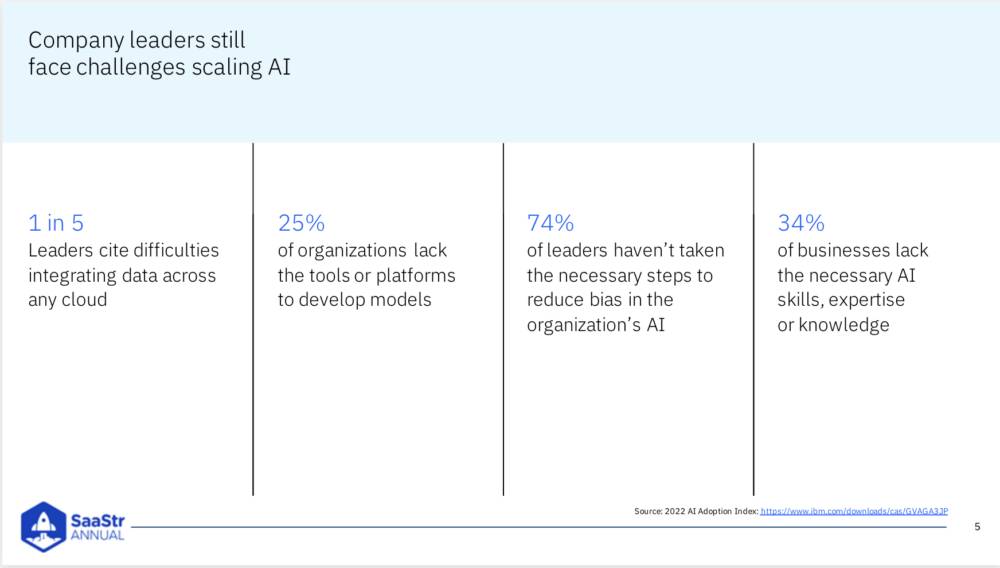 AI adoption has grown exponentially over the past year and it has likely doubled from its more than 2.5x growth in the last few months alone. At SaaStr Annual, IBM’s VP of Software and Technology Raj Datta and Director of Startups Kylie Rutherford shared how AI is changing the game for companies of all sizes.