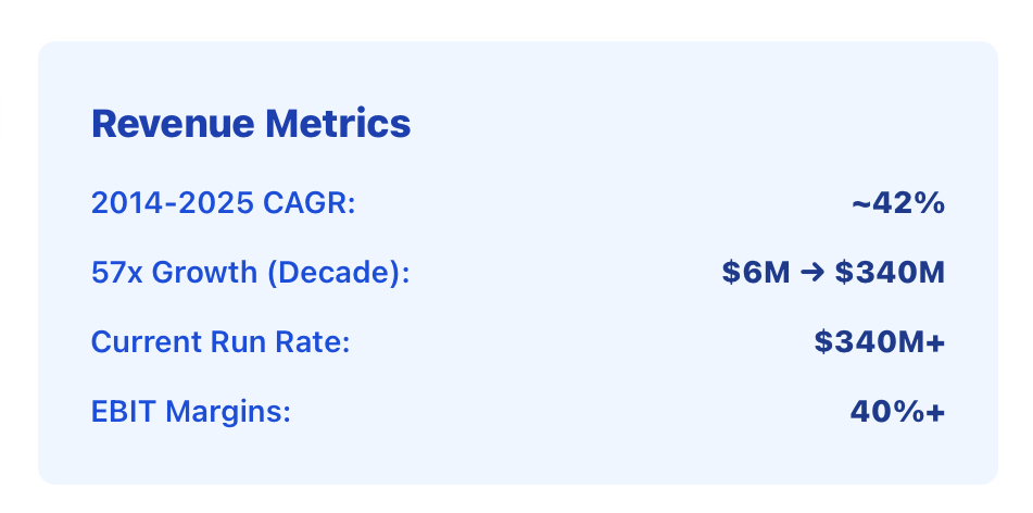- Margins: 40%+ EBIT margins since 2023