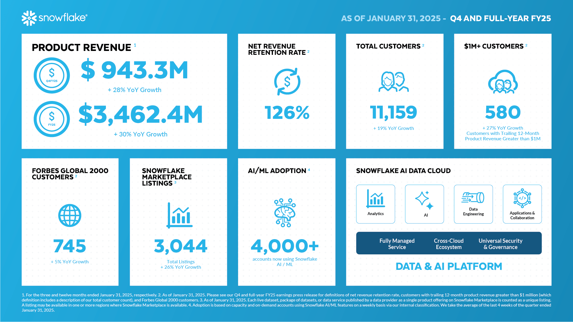 Snowflake had a strong Q4, with product revenue coming in at $943 million, up 28% year-over-year. Overall, FY25 revenue was $3.5 billion, up 30% year-over-year.