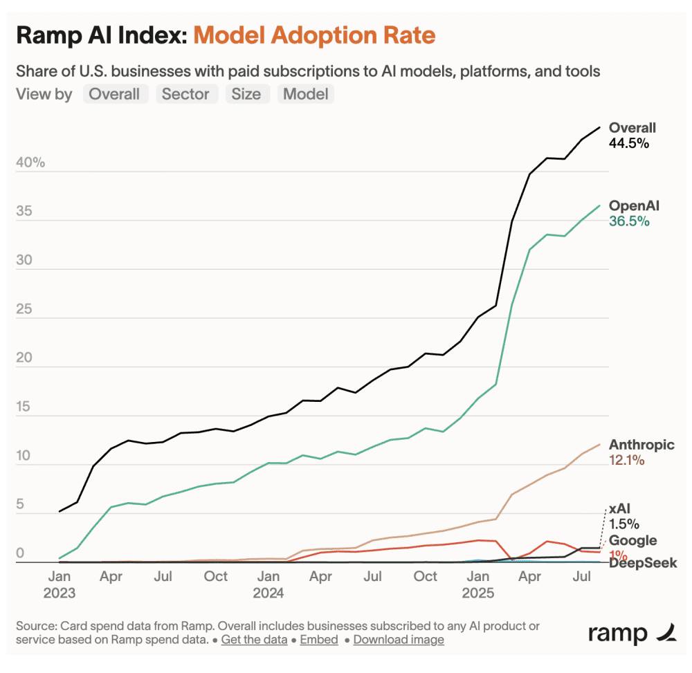 - Current landscape: OpenAI leads at 36.5%, Anthropic accelerating at 12.1%, with 44.5% overall business adoption