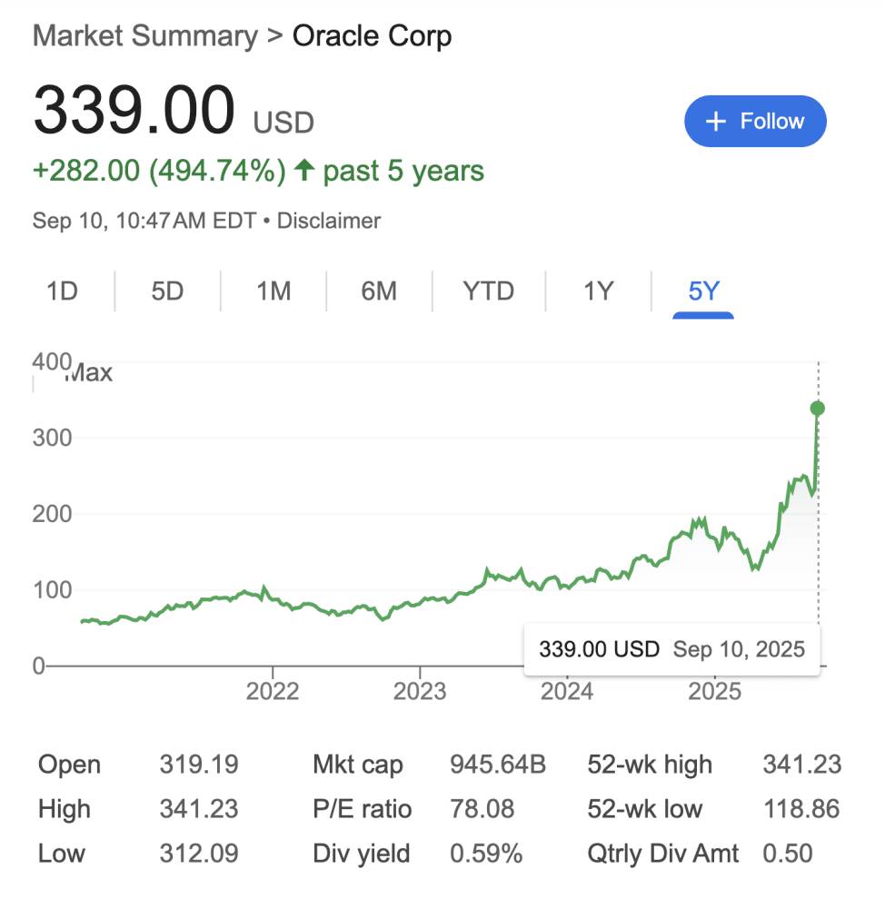 But the real kicker from the latest quarter—Oracle actually missed earnings expectations. They came in at $1.47 per share vs. $1.48 expected, and total revenue was $14.9 billion (up 12% YoY) vs. expectations. Yet the stock exploded 40% anyway.