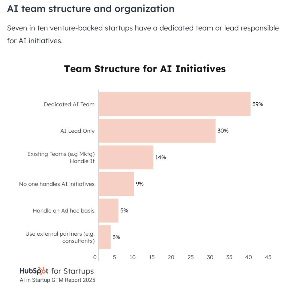 So it was very interesting to me to see HubSpot’s latest AI in Startup GTM Strategy Report note how key it is to do just that. Across 500+ venture-backed start-ups surveyed, 39% had a dedicated AI team, and 30% had an AI lead.