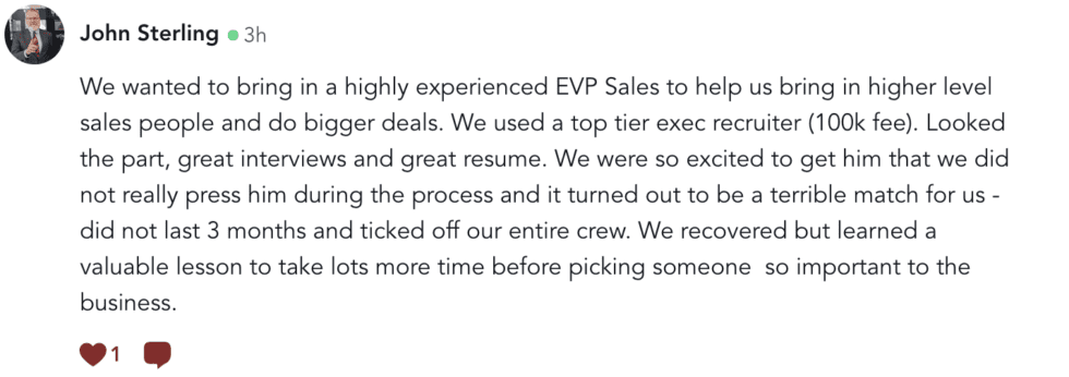 The first one that didn’t work out was for a VP Sales position for a fast-growing SaaS company at about $4m in ARR. The company had never had a true VPS before, and clearly, it was time. No VP of Sales candidate is perfect — if they are, something’s off. Why would they take the job if it’s exactly what they’ve done before successfully? But this candidate was good. He had managed a team of 20 before, hired 8 of them successfully, and 3 of the best ones were ready to join him. He had sold at a similar ACV and even in the same vertical. And he clearly cared a lot, and was excited about selling the product.
