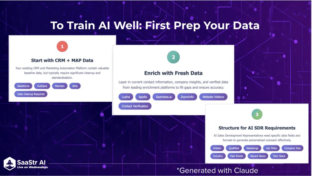 - Training Data: 20+ million words of SaaStr content, 10+ years of CRM data and marketing automation data