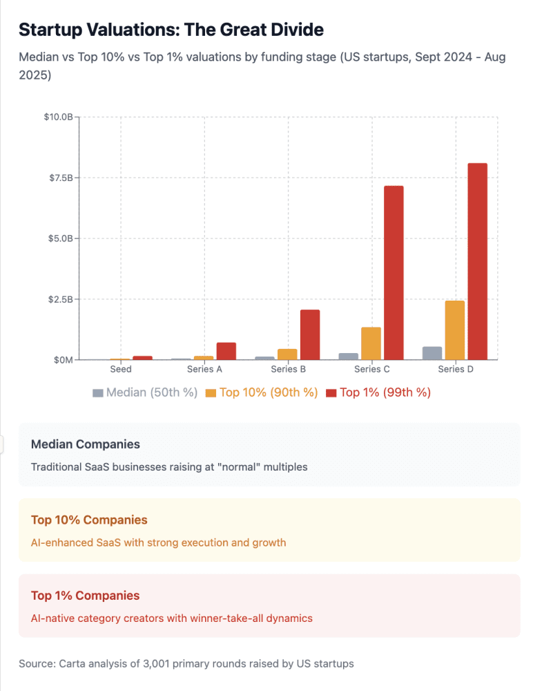 The gap suggests that investors believe the top 1% of AI companies will capture disproportionate value compared to everything else. Historically, when this kind of valuation divergence happens in venture, it means one of two things: