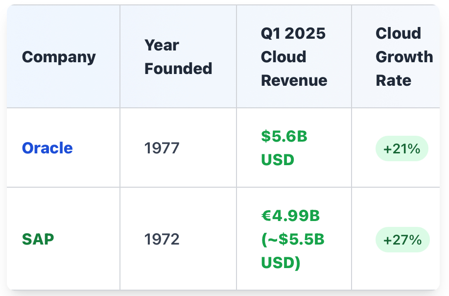 Here’s the uncomfortable truth: Oracle is 47 years old. SAP is 52 years old. These companies have legacy codebases, technical debt, and organizational complexity that would make most startup founders break out in cold sweats. Yet they’re posting growth rates that would make unicorn startups jealous.