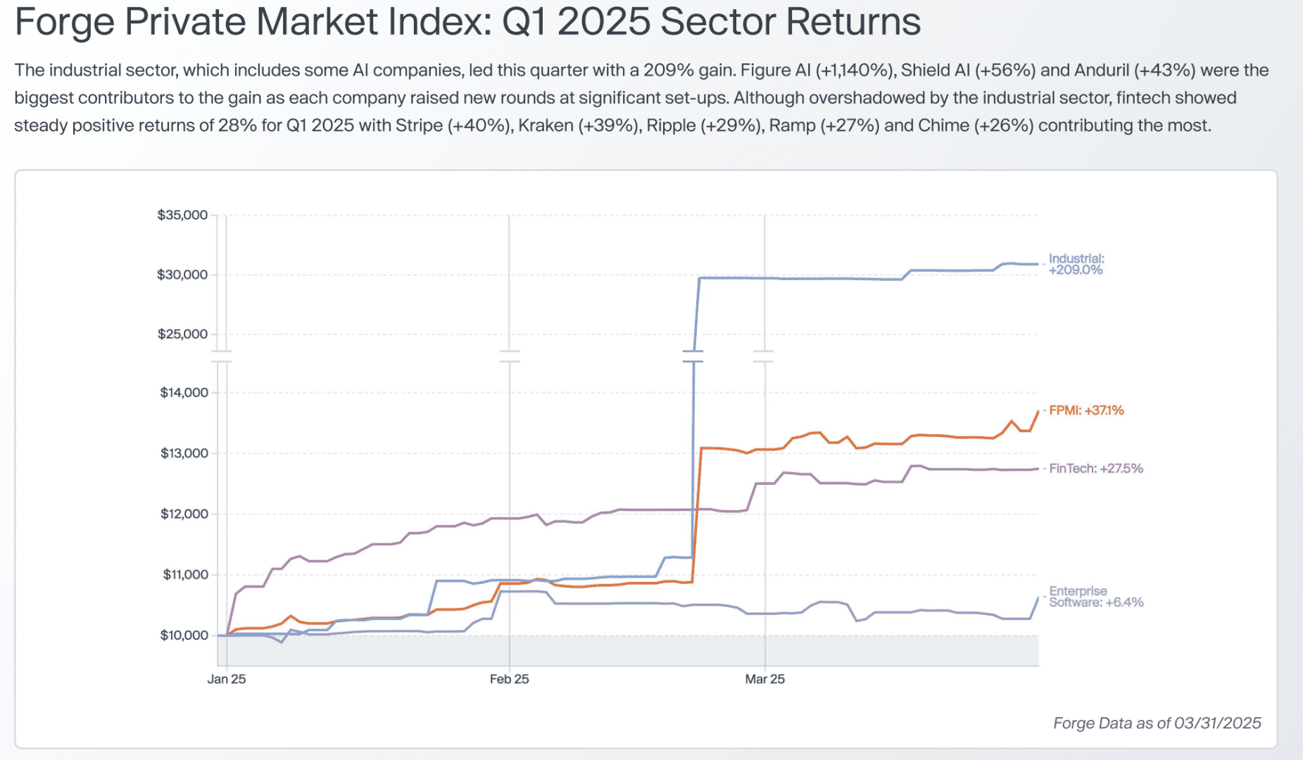 There is overlap between enterprise software and fintech. And fintech showed positive returns of 28% for Q1 2025 with Stripe (+40%), Ramp (+27%) and Chime (+26%) materially up.